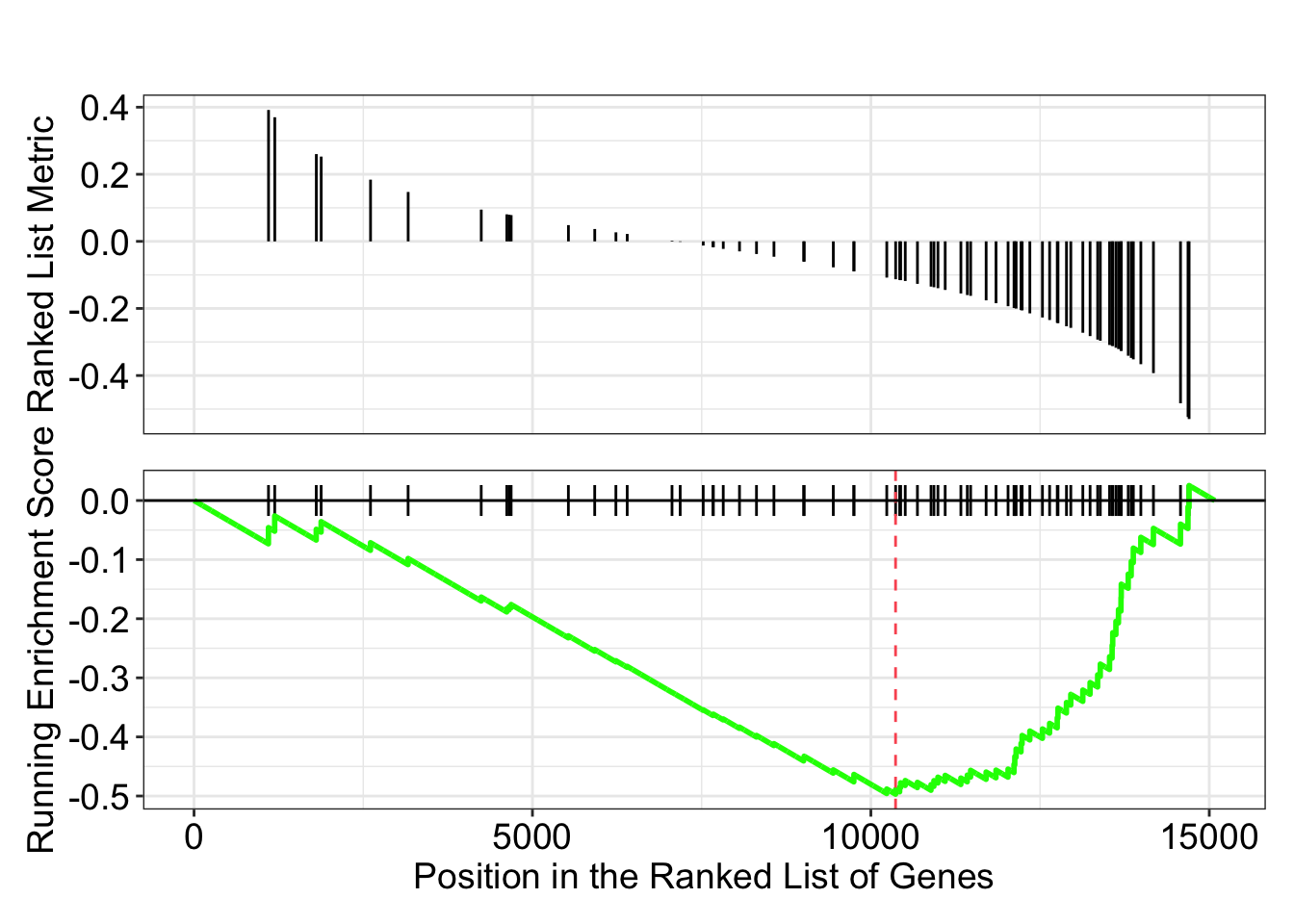Let’s explore the GSEA plot of enrichment of one of the pathways in the ranked list: