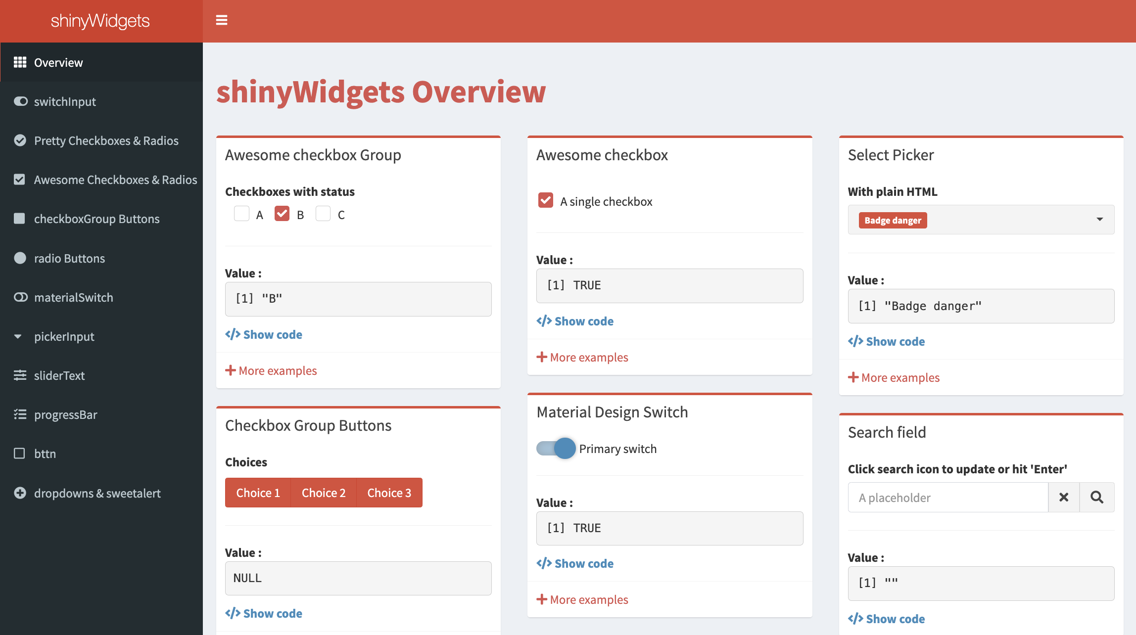 Also, to enhance the widget inputs, shinyWidgets is an R package that you can install that gives you even more stylistic options for your Shiny app. The gallery of input widgets that you can create using shinyWidgets can be found here. A useful part of the gallery is that each input widget displayed has a </> Show code section that gives you the code needed to create the input widget on the UI side.