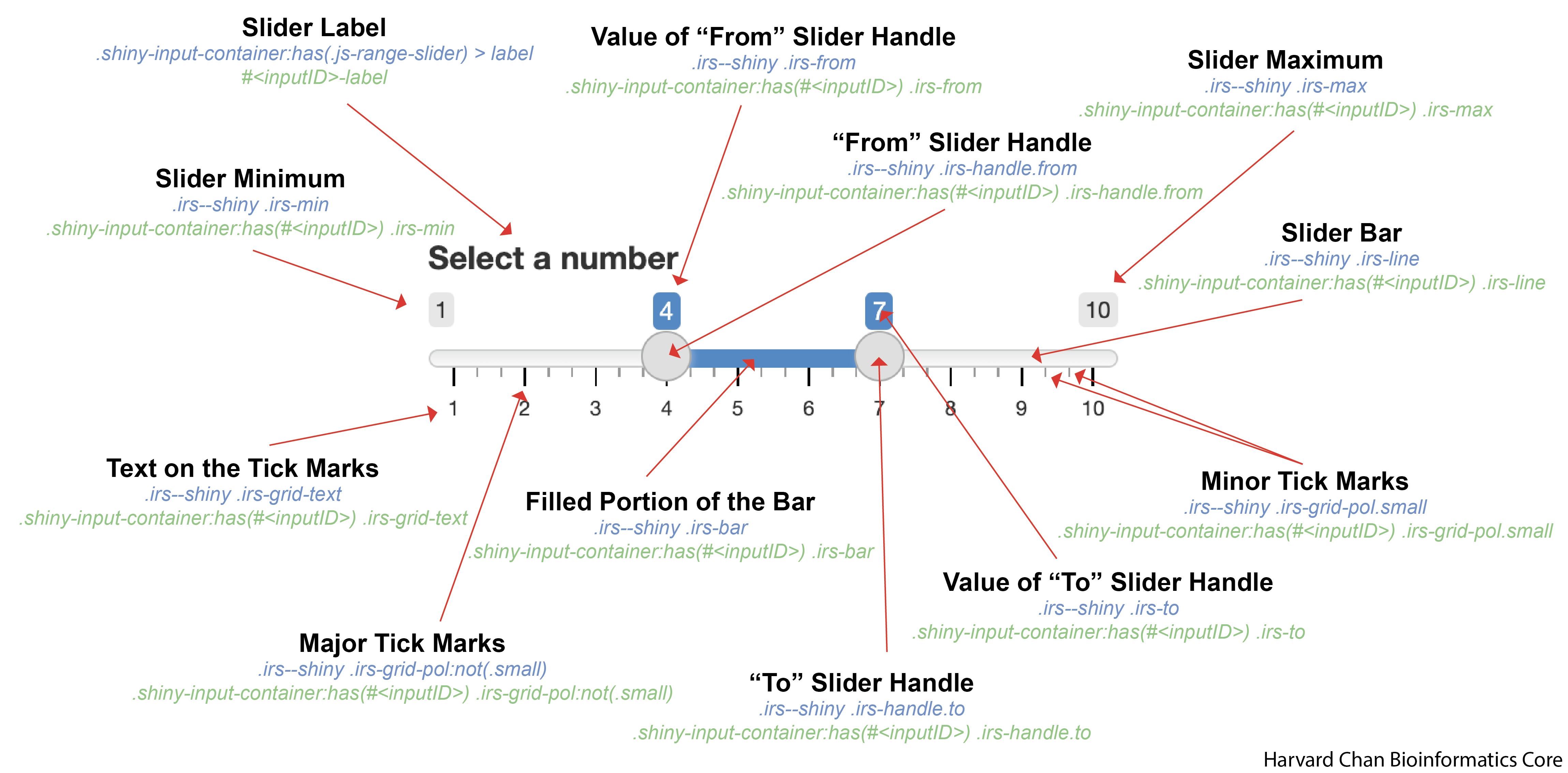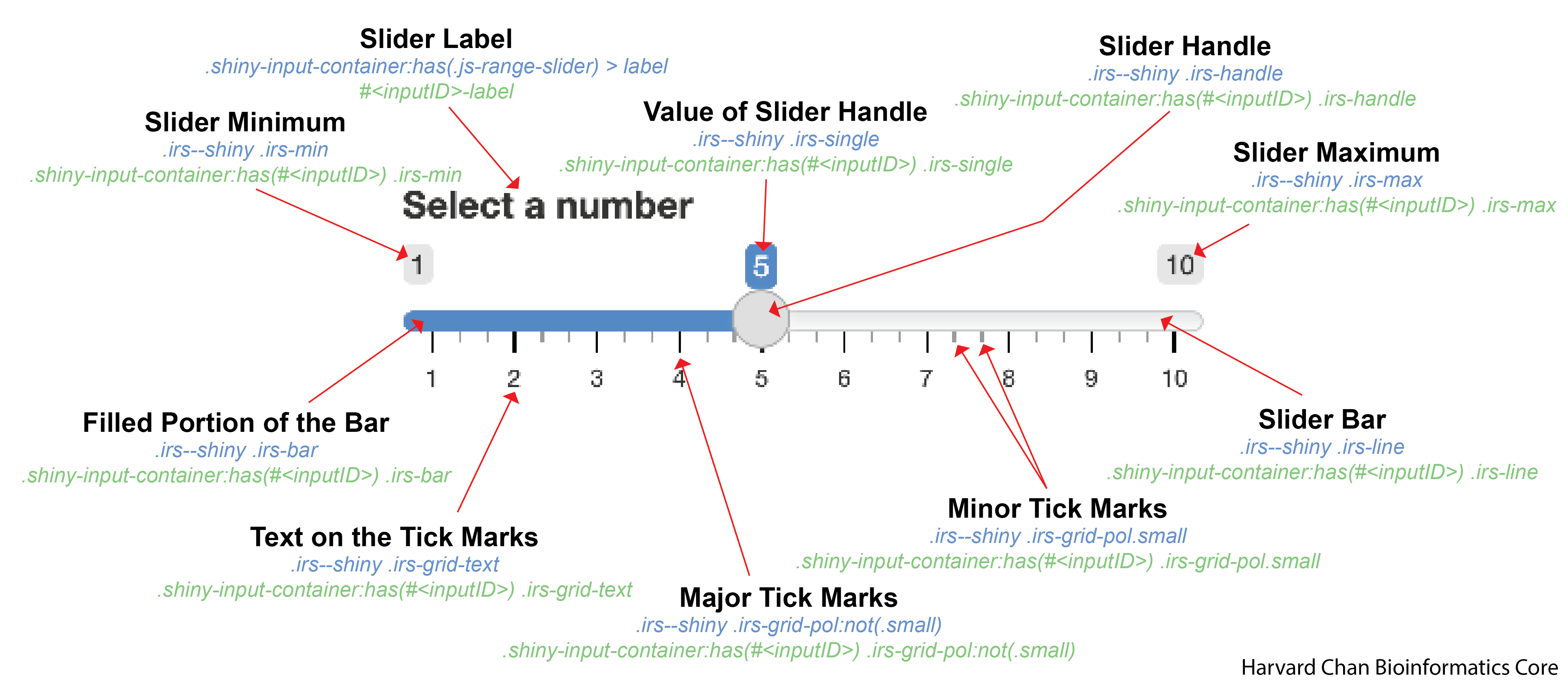 Below is a key for the many of the elements that can be altered within the sliderInput():