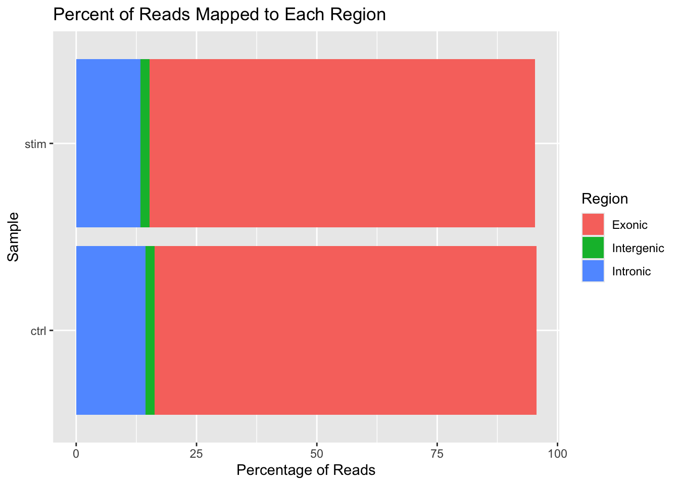 With all of this information available as a dataframe, we can use ggplot to visualize these values. As an example of how this information can be used, we can display what percentage of reads map to the various parts of the genome (Intergentic, Intronic, and Exonic).