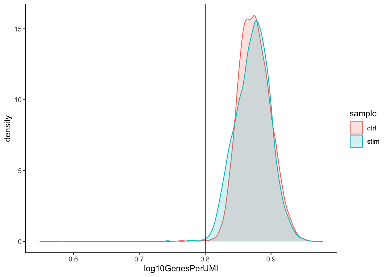 $log10GenesPerUMI <- log10(merged_seurat$nFeature_RNA) / log10(merged_seurat$nCount_RNA) merged_seurat