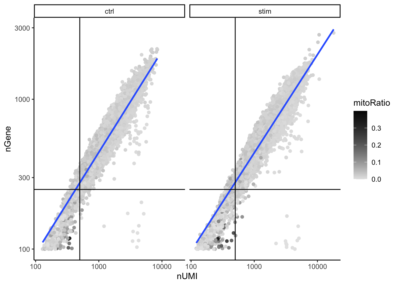 Good cells will generally exhibit both higher number of genes per cell and higher numbers of UMIs (upper right quadrant of the plot). Cells that are poor quality are likely to have low genes and UMIs per cell, and correspond to the data points in the bottom left quadrant of the plot. With this plot we also evaluate the slope of the line, and any scatter of data points in the bottom right hand quadrant of the plot. These cells have a high number of UMIs but only a few number of genes. These could be dying cells, but also could represent a population of a low complexity celltype (i.e red blood cells).