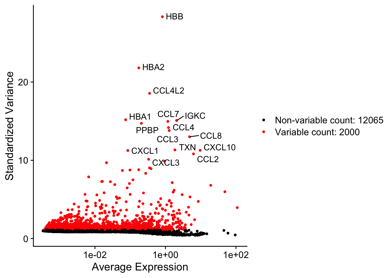 HBB, HBA2, CCL4L2, HBA1, IGKC, CCL7, PPBP, CCL4, CCL3, CCL8