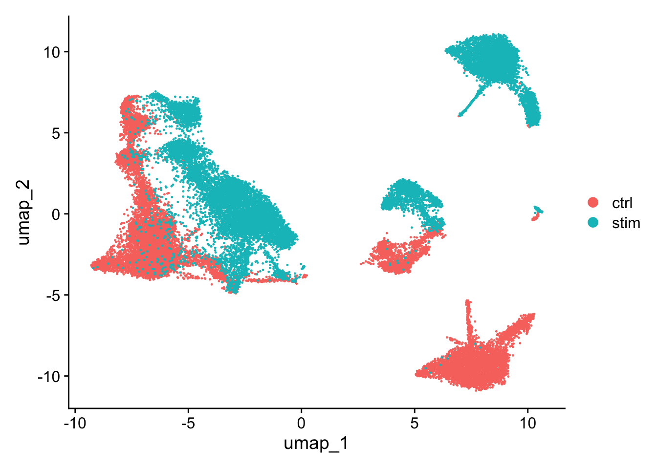 Do not just always perform integration because you think there might be differences - explore the data. If we had performed the normalization on both conditions together in a Seurat object and visualized the similarity between cells, we would have seen in our dataset there is condition-specific clustering: