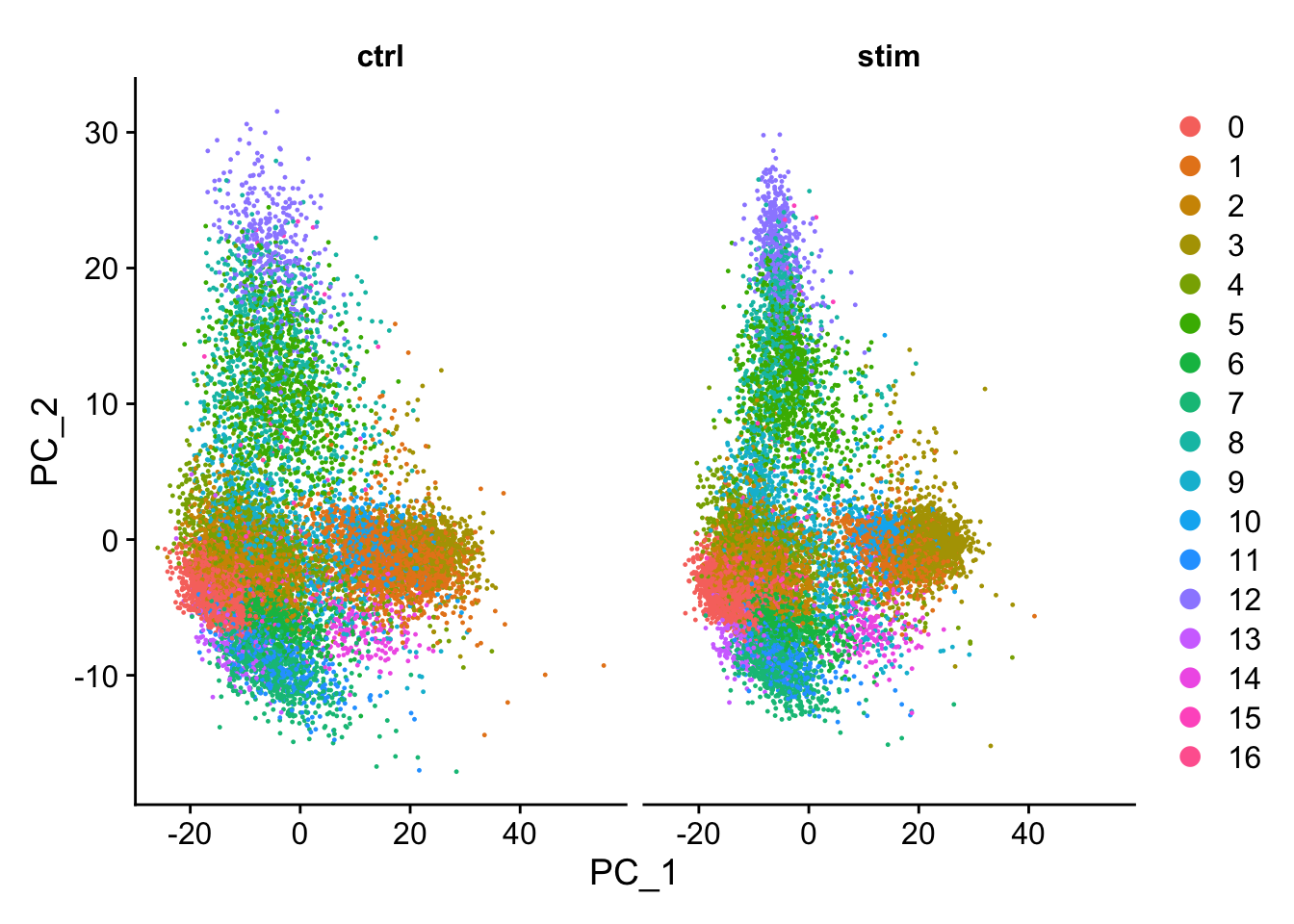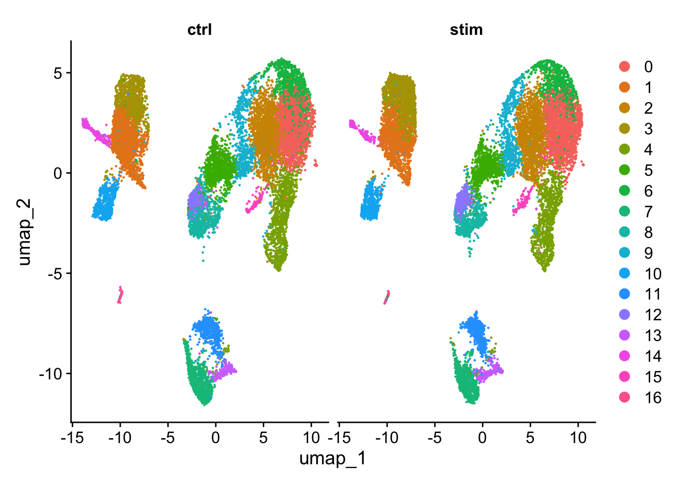 When we compare the similarity between the ctrl and stim clusters in the above plot with what we see using the the unintegrated dataset, it is clear that this dataset benefitted from the integration!