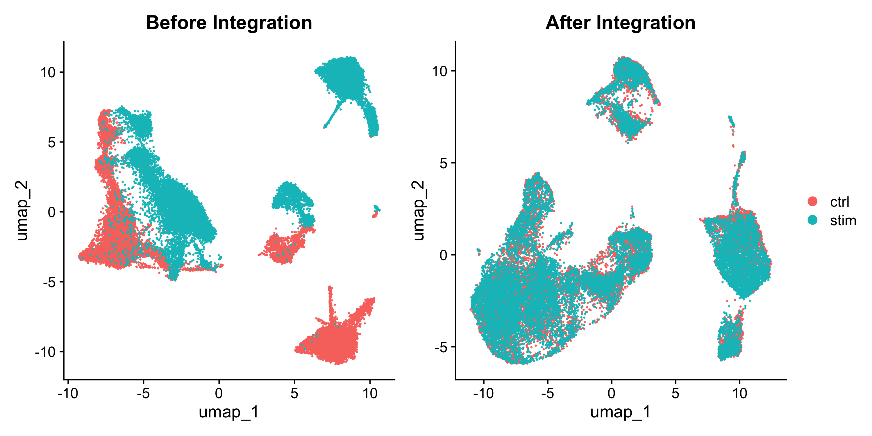 Often with single cell RNA-seq we are working with multiple samples which correspond to different sample groups, multiple experiments or different modalities. If we want to ultimately compare celltype expression between groups it is recommended to integrate the data. Integration is a powerful method that uses these shared sources of greatest variation to identify shared sub-populations across conditions or datasets (Stuart and Butler et al. (2018)). There are several steps involved in performing intergration in Seurat. Once complete, we use visualization methods to ensure a good integration before we proceed to cluster cells.