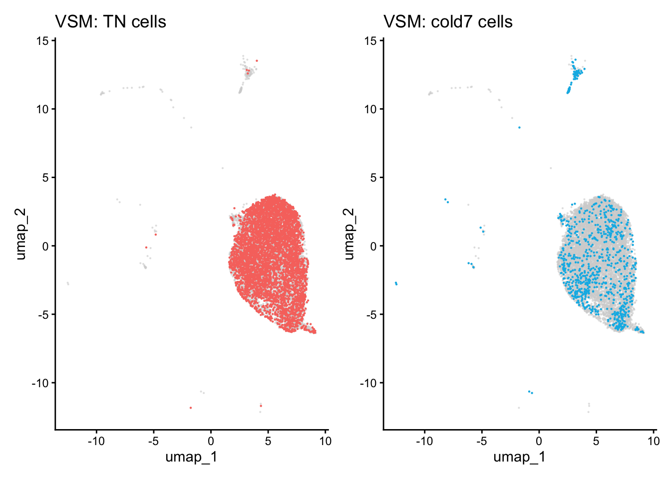 # Grab the umap coordinates and condition information for each celldf <-FetchData(seurat_vsm, c("umap_1", "umap_2", "condition"))df_tn <- df %>%subset(condition =="TN")df_cold7 <- df %>%subset(condition =="cold7")# Scatterplot of TN cellsp_tn <-ggplot() +geom_point(data=df, aes(x=umap_1, y=umap_2), color="lightgray", alpha=0.5, size =0.1) +geom_point(data=df_tn, aes(x=umap_1, y=umap_2), color="#F8766D", size =0.1) +theme_classic() +ggtitle("VSM: TN cells")# Scatterplot of cold7 cellsp_cold7 <-ggplot() +geom_point(data=df, aes(x=umap_1, y=umap_2), color="lightgray", alpha=0.5, size =0.1) +geom_point(data=df_cold7, aes(x=umap_1, y=umap_2), color="#00B8E7", size =0.1) +theme_classic() +ggtitle("VSM: cold7 cells")# TN and cold7 UMAPs side by sidep_tn + p_cold7