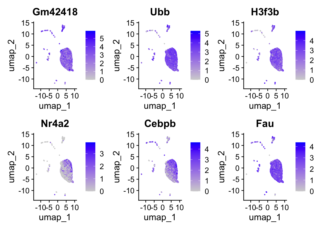 [1] "Gm42418" "Ubb" "H3f3b" "Nr4a2" "Cebpb" "Fau"