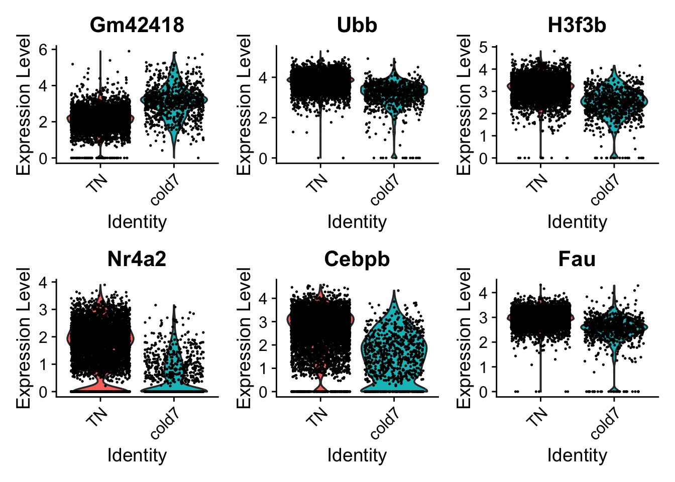 # Set Idents and draw Violin plots for top 6 genesIdents(seurat_vsm) <-"condition"VlnPlot(seurat_vsm, genes, ncol=3, idents=c("TN", "cold7"))