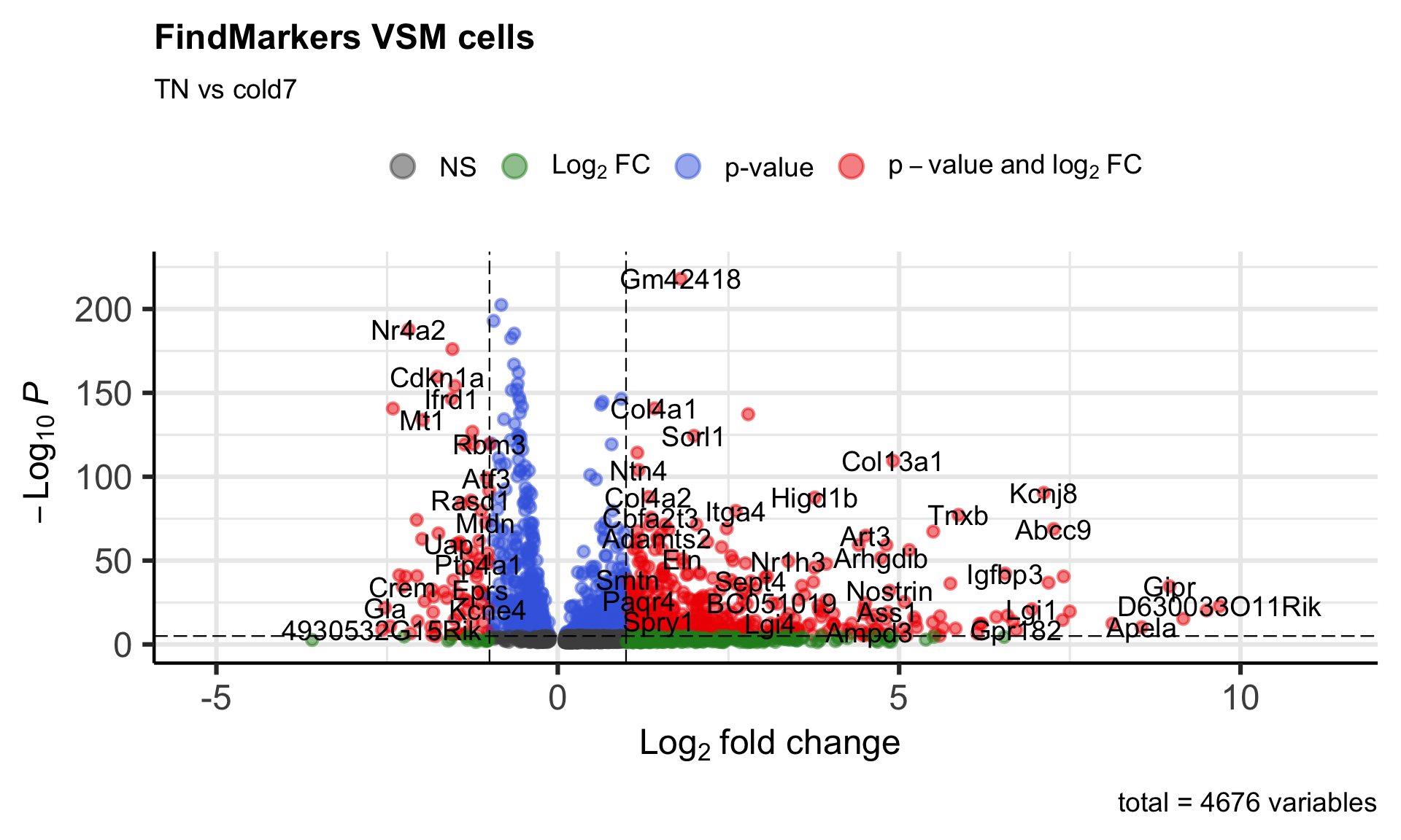 # Volcano plotp_fm <-EnhancedVolcano(dge_vsm_sig,row.names(dge_vsm_sig),x="avg_log2FC",y="p_val_adj",title="FindMarkers VSM cells",subtitle="TN vs cold7")p_fm