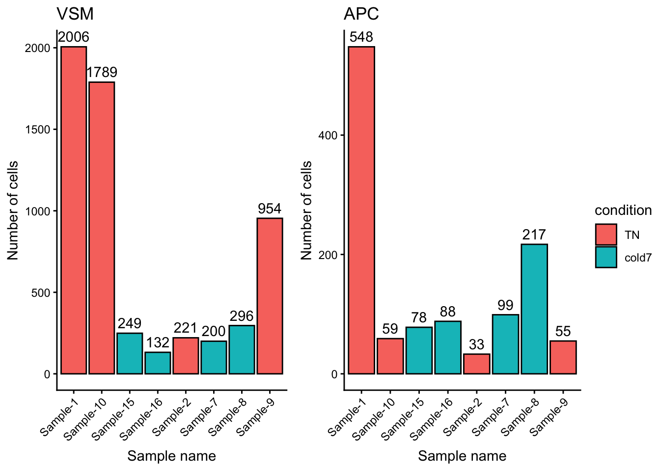 bulk_APC <- subset(bulk, subset = (celltype == "AP") & (condition %in% c("TN", "cold7")))- Plot the cell number distribution across samples. How do the numbers compare to VSM cells?