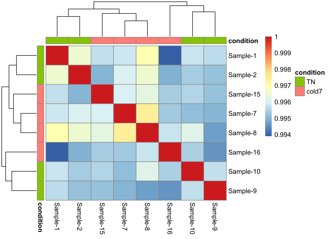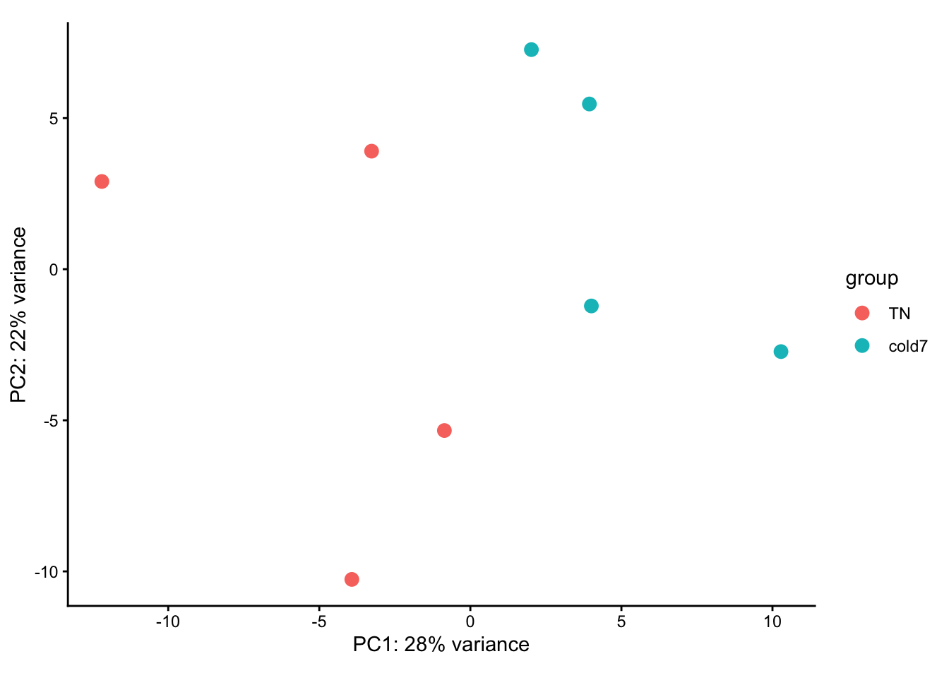 Unfortunately, the samples do not neatly separate by condition in this celltype. As shown in the PCA plot, three cold7 samples (7,8,15) are closely related on PC1, while the last cold7 sample (16) is more distant and groups with two TN samples (9,10) on PC2.