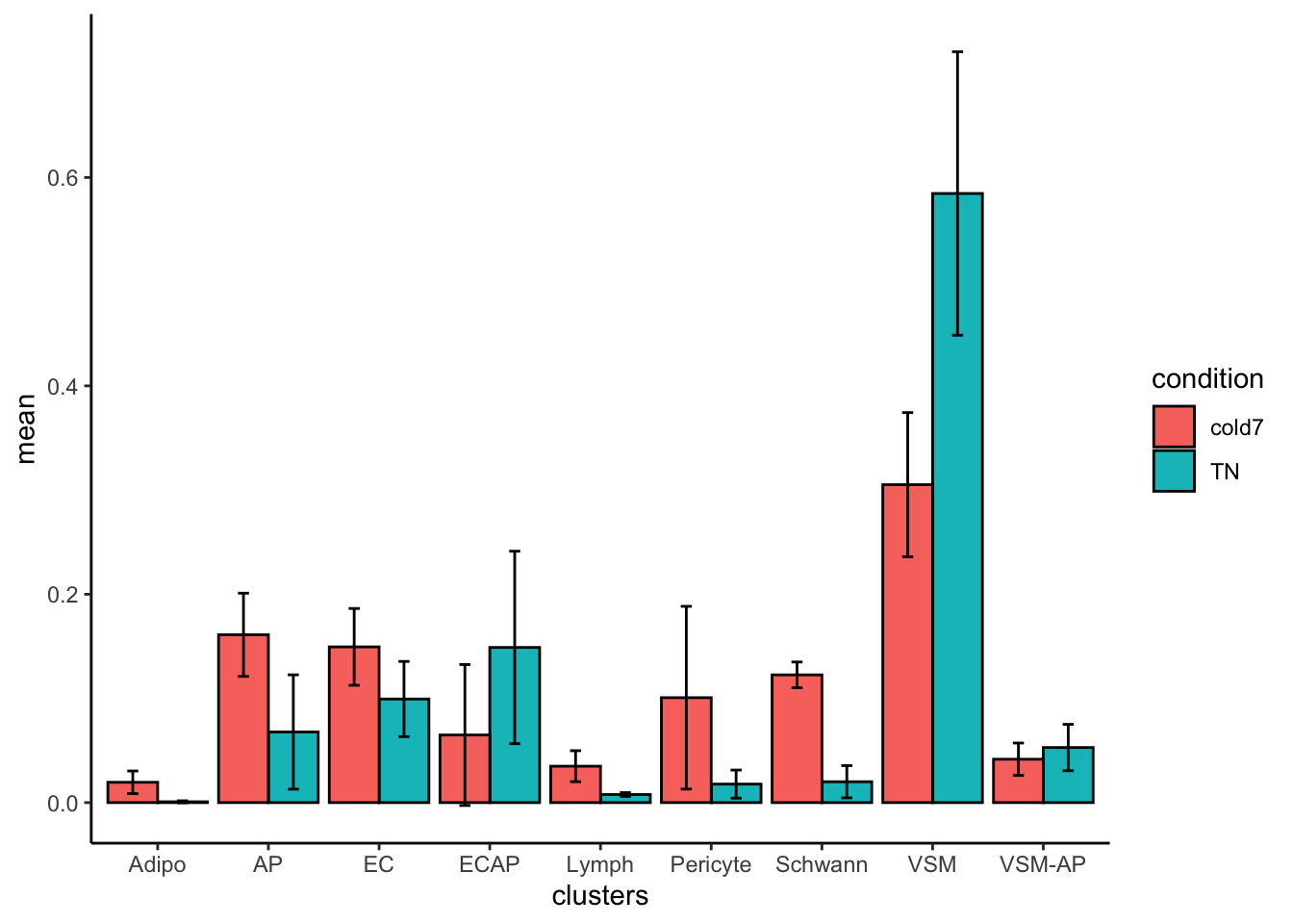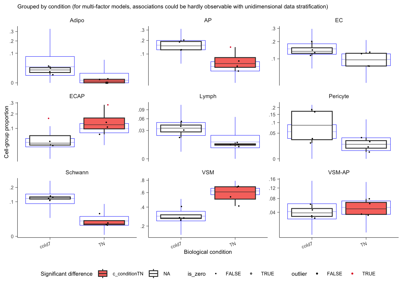 If we look at the significant results of each method side-by-side, we find there is concordance in the majority of the celltypes in which proportions of cells were significantly different between conditions. We also see that both methods report the endothelial cells (EC) are not changing in composition between TN and cold7. There is discrepancy in the Endothelial cell-derived progenitor cells (ECAP) and the VSM-derived adipocyte progenitor cells (VSM-AP), as propellor reports that these celltypes do not change in proportion. Looking at the underlying data for results identified by only one of the methods is not entirely convincing. Best practice may be to run both methods and compare results. The most conservative approach would be to take the intersection of the two methods.