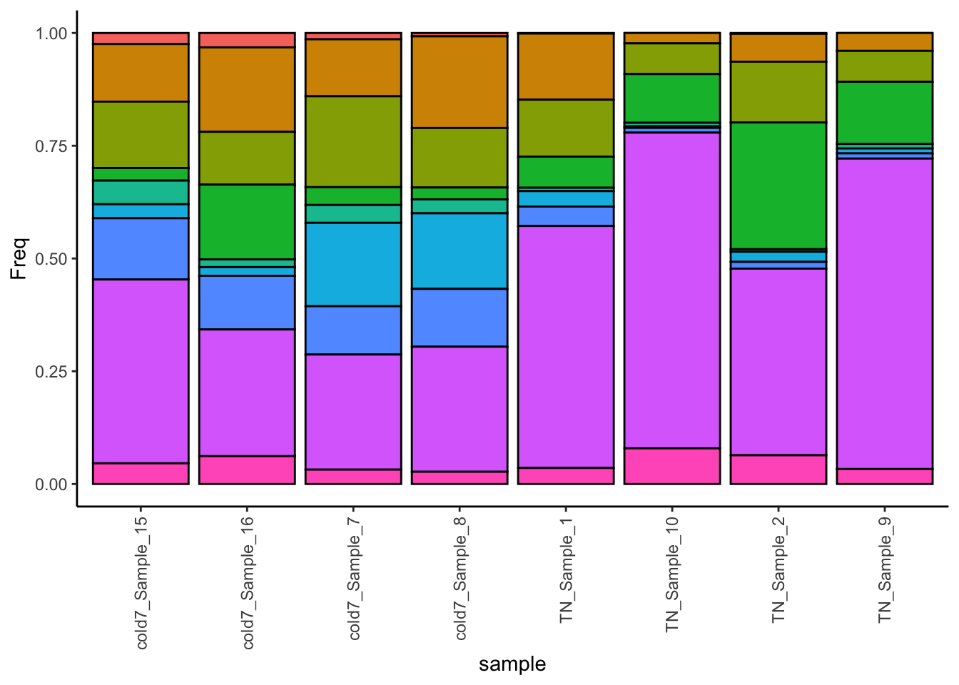 geom_bar(aes(x=sample, y=Freq, fill=clusters),