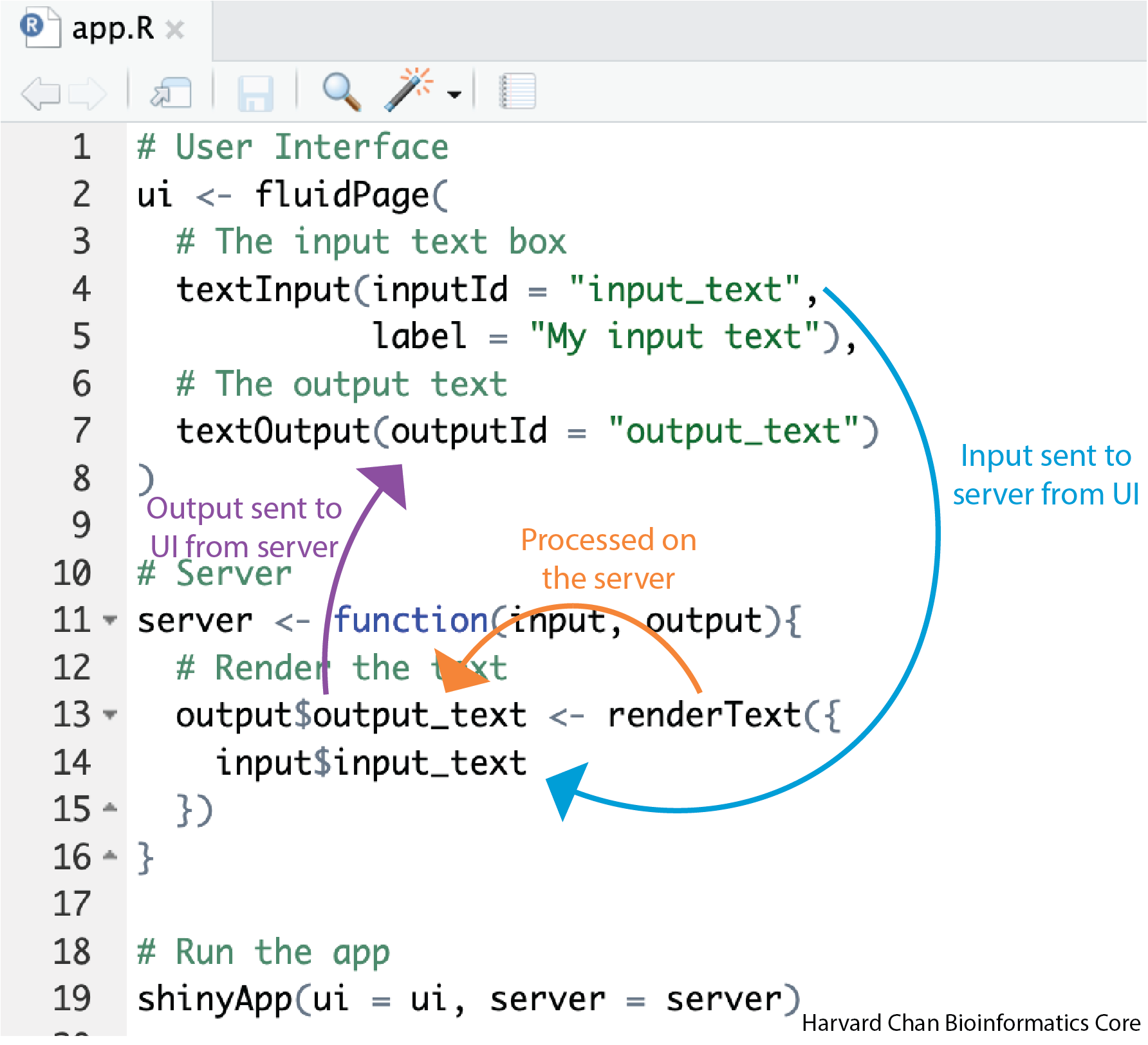 - Server - This section provides the instructions for how input data will be processed and returned by the app. This is referred to as the back-end of the app