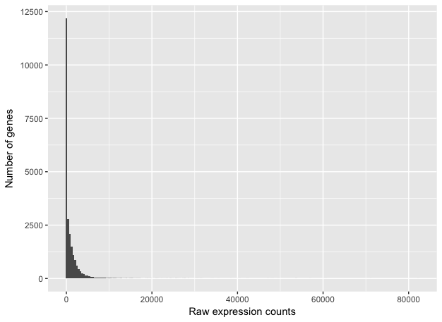 To determine the appropriate statistical model, we need information about the distribution of counts. To get an idea about how RNA-seq counts are distributed, we can plot the counts for a single sample: