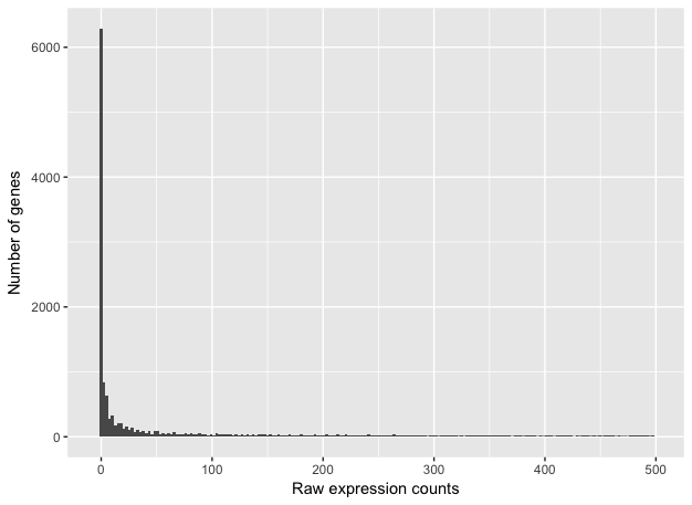 If we zoom in close to zero, we can see that there are a large number of genes with counts of zero:
