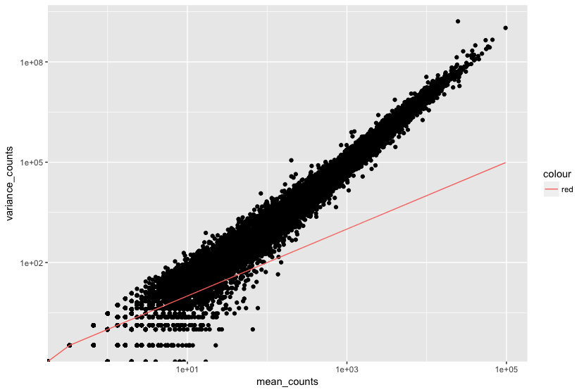 - The variance across replicates tends to be greater than the mean (red line), especially for genes with large mean expression levels.