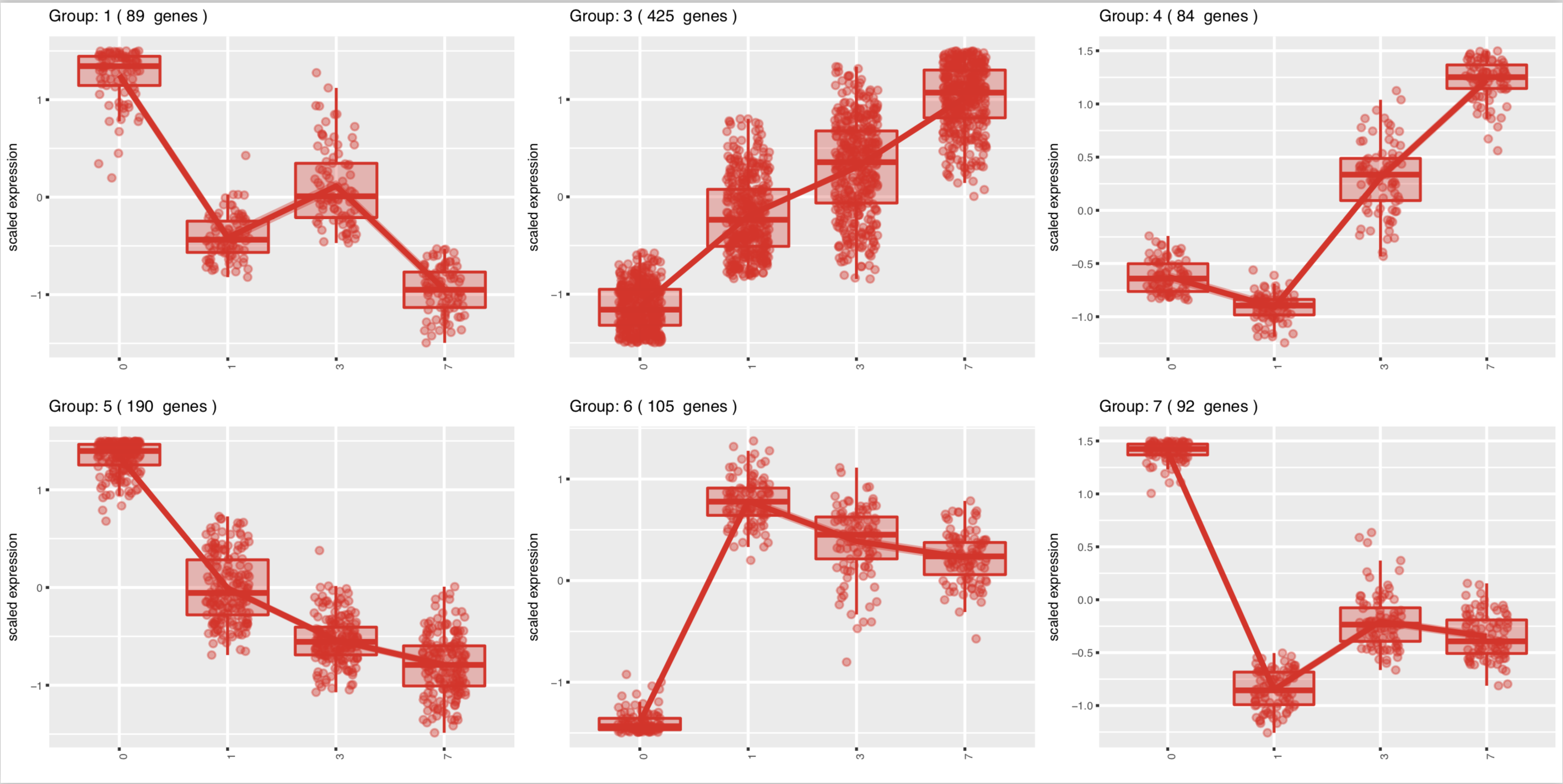 Plot 2: When performing DE analysis on several groups, e.g. a time course experiment, grouping together genes that have similar patterns of expression and visualizing these patterns can be very helpful. The degPatterns() function in the DEGreport package performs the analysis and creates a display with this information.