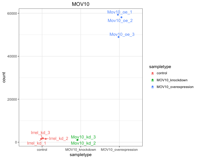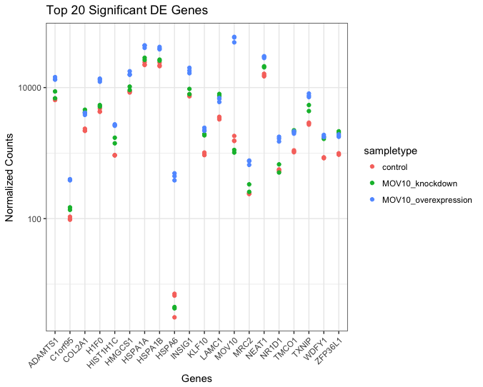 The plot below displays the top 20 significantly differentially expressed genes. Please note that the normalized counts on the Y axis are logged (log10) to ensure that the any large differences in expression are plotted without compromising the quality of the visualization.