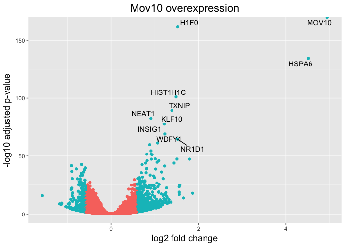 The above plot would be great to look at the expression levels of a good number of genes, but for more of a global view there are other plots. A commonly used one is a volcano plot; in which you have the log transformed adjusted p-values are plotted on the y-axis and log2 fold change values on the x-axis.