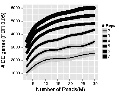 As the figure above illustrates, biological replicates are of greater importance than sequencing depth. The figure shows the relationship between sequencing depth and number of replicates on the number of differentially expressed genes identified [1]. Note that an increase in the number of replicates tends to return more DE genes than increasing the sequencing depth. Therefore, generally more replicates are better than higher sequencing depth, with the caveat that higher depth is required for detection of lowly expressed DE genes and for performing isoform-level differential expression.