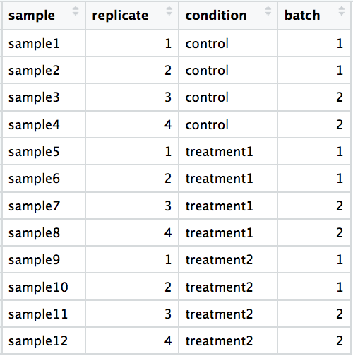 RNA isolationcolumn of the metadata table. Since we can only prepare 2 samples at a time and we have 12 samples total, you will need to isolate RNA in 6 batches. In theRNA isolationcolumn, enter one of the following values for each sample:group1,group2,group3,group4,group5,group6. Make sure to fill in the table so as to avoid confounding by batch ofRNA isolation. -