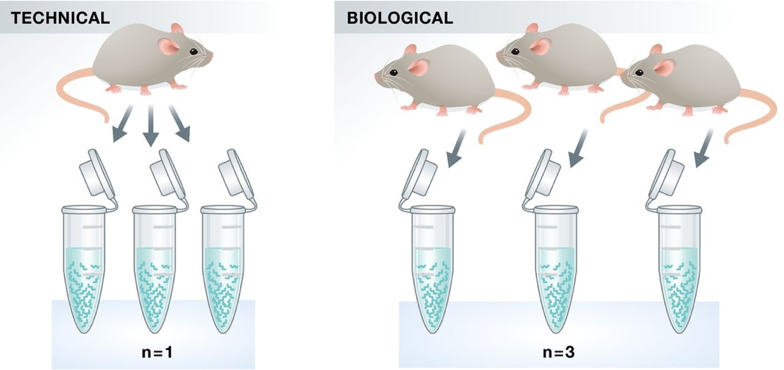 Experimental replicates can be performed as technical replicates or biological replicates.